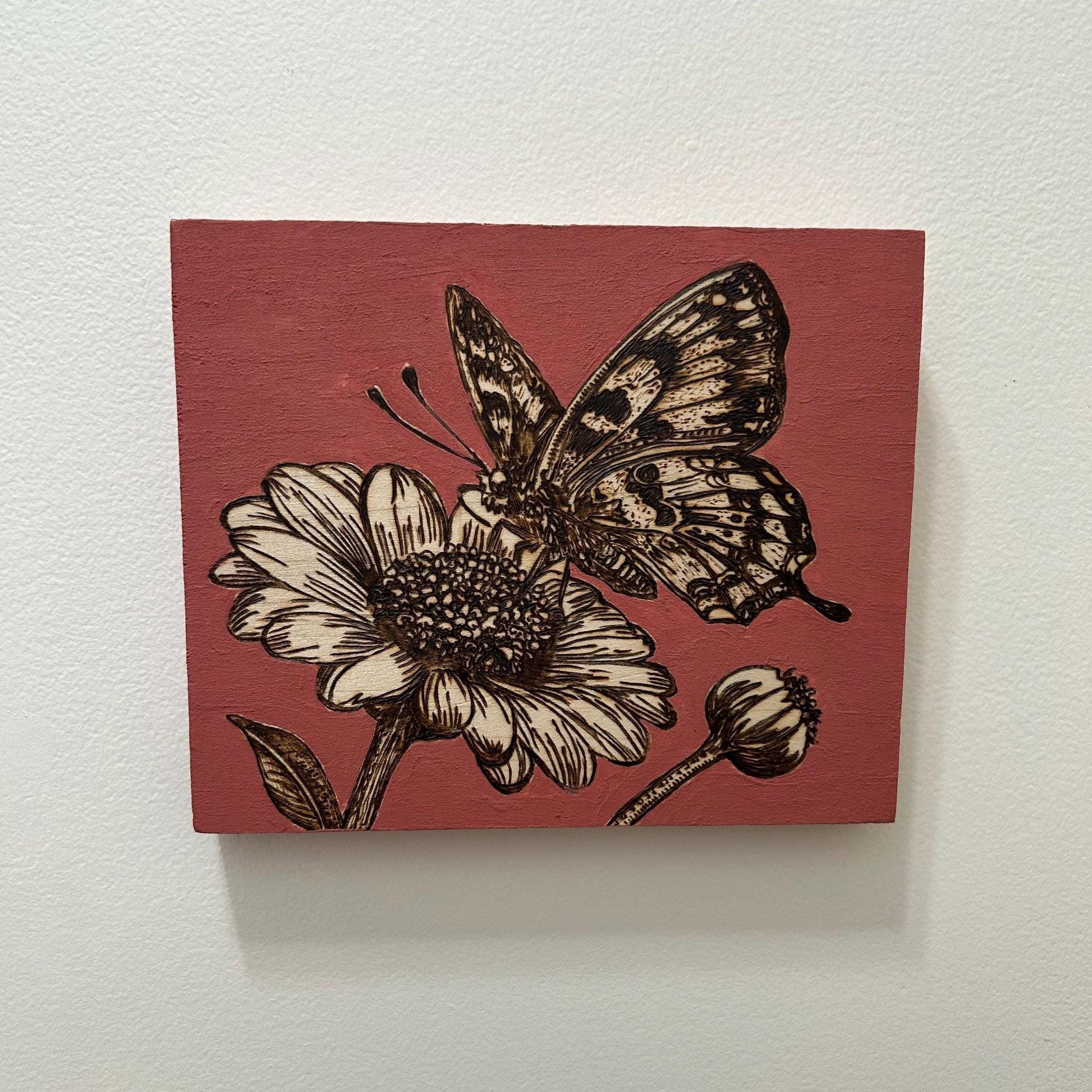 Hand-burned Intricate Butterfly Floral Woodburning Art