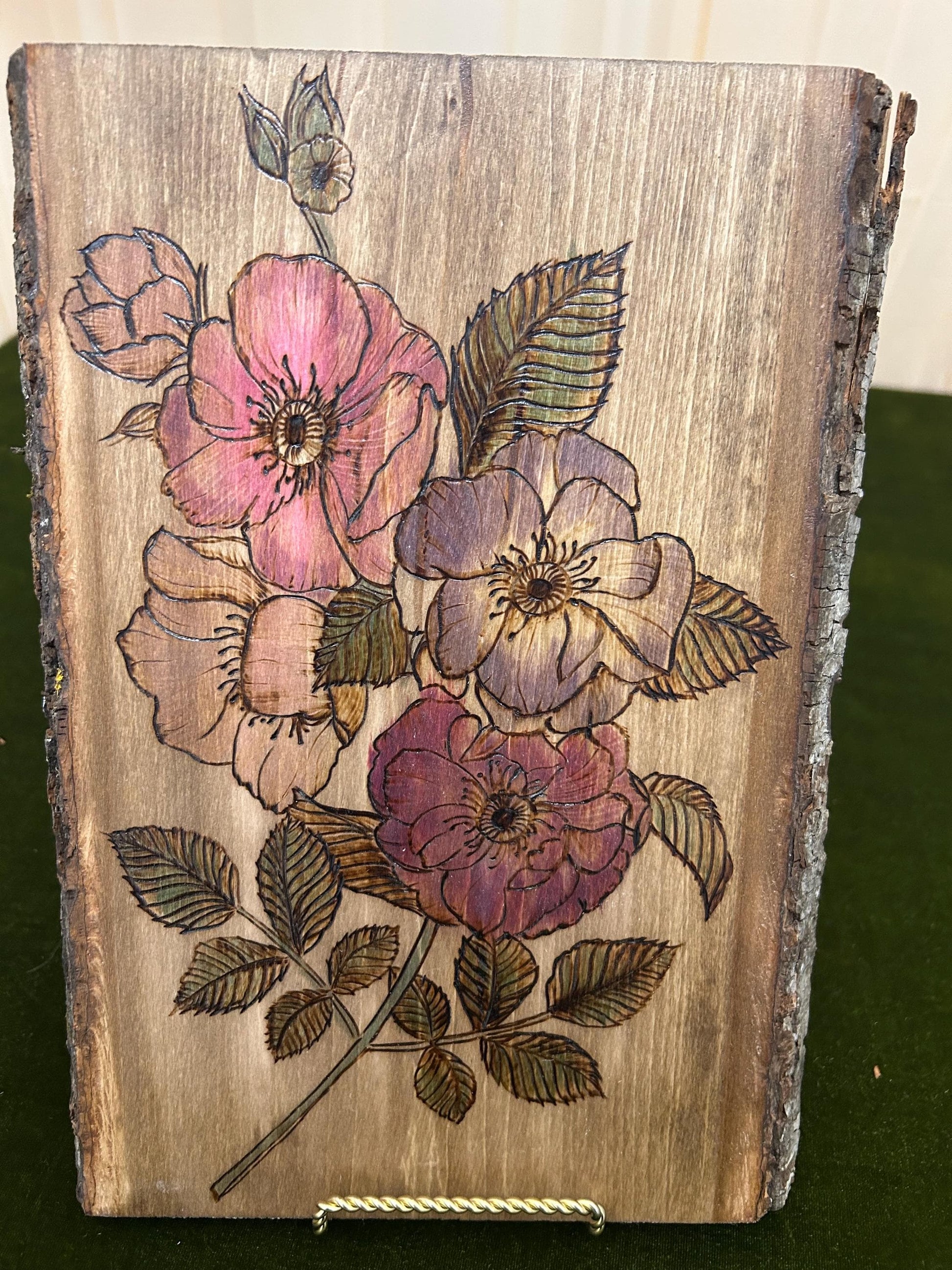 Beautifully intricate handburned floral and leaf piece.