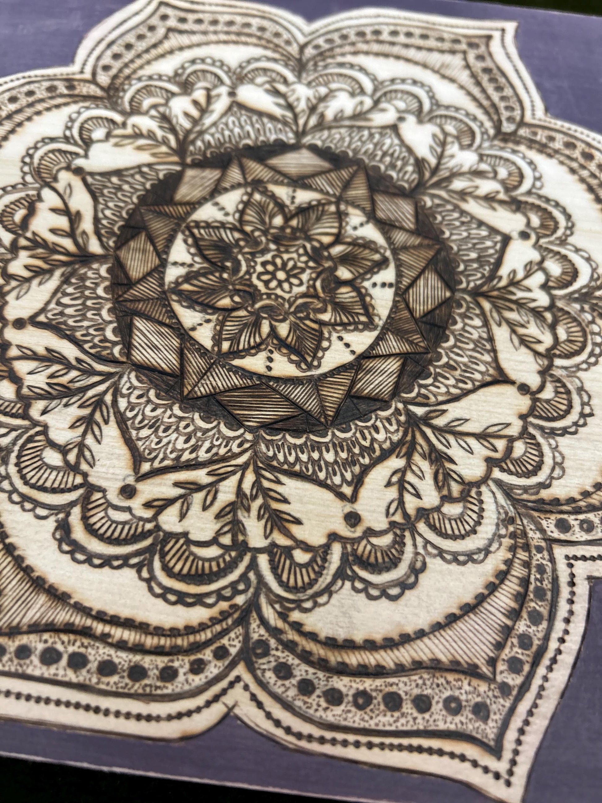 Woodburned Mandala Pyrography Wood Fine Art, intricate hand-drawn mandala, purple distressed, home decor, gifts for her, spiritual, mystical